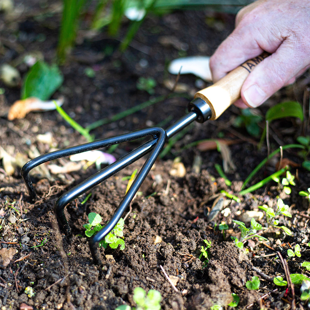 The AMES Carbon Steel Hand 3 Prong Cultivator is designed for breaking up and aerating soil in borders or beds to enhance nutrient or water absorption.