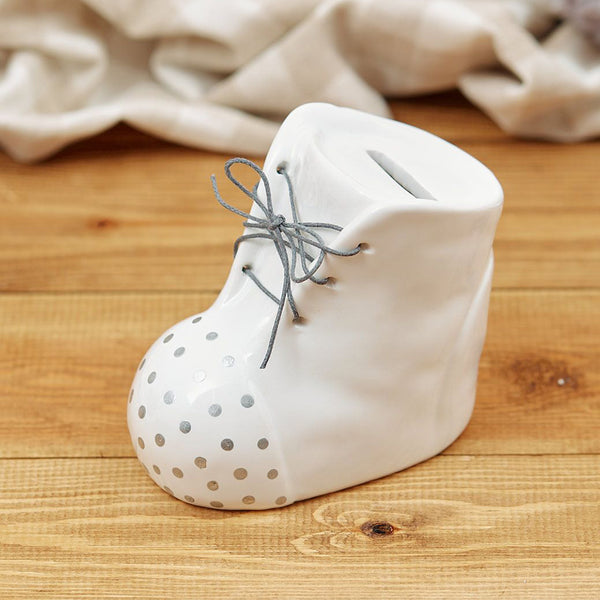 - Baby Bootie Money Bank White Ceramic with Silver Spots