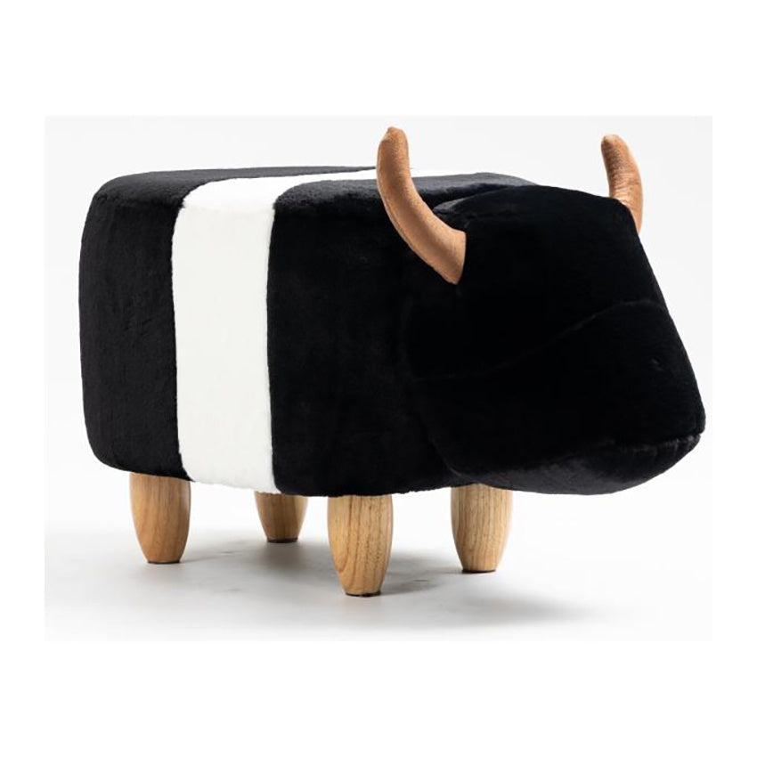 Lightweight cow-shaped padded footstool made with a velvet exterior. Comes with four wooden legs and velvet pads for floor protection. This model is named Beltie and comes in a belted black & white pattern.