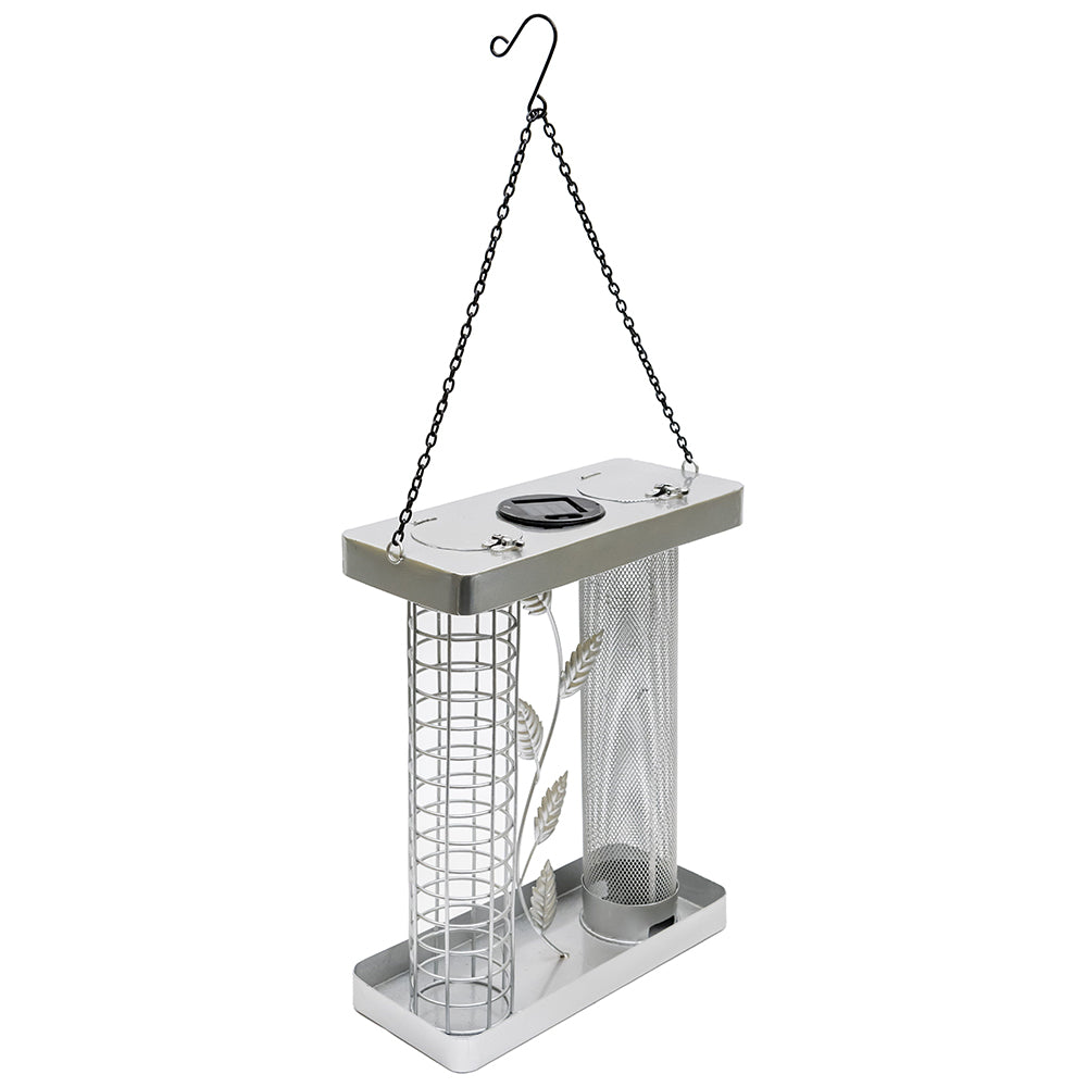 This stunning solar feeder will add a touch of elegance to your garden, and the birds will love it too. Available in silver or copper, the twin feeder features a seed feeder and fatball feeder with easy open lids. The lovely leaf design in the middle adds an extra decorative feature, and the solar light creates a warm glow as it gets dark. Complete with chain to hang in your chosen location.